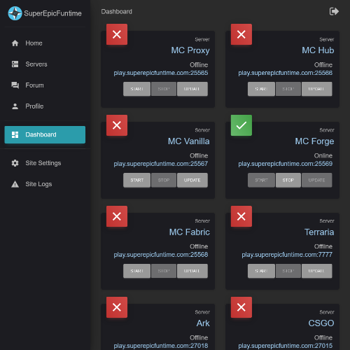 stop, update, or view logs for game servers. Implements oAuth 2.0 with a custom-built